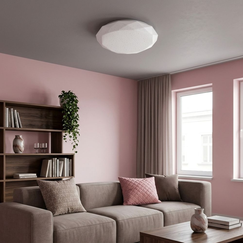 Unesite dašak elegancije u svoj dom uz LED plafonjeru R-A07 Diamond. Ovaj model karakteriše upečatljiv poliedarski dizajn difuzora koji podseća na brušeni dijamant. Zahvaljujući specifičnim ivicama koje prelamaju svetlost i integrisanom "starry sky" efektu, ova plafonjera stvara suptilno svetlucanje koje svakoj prostoriji daje sofisticiran izgled.