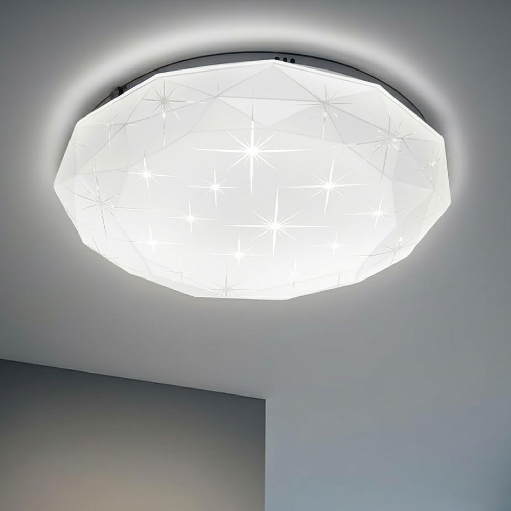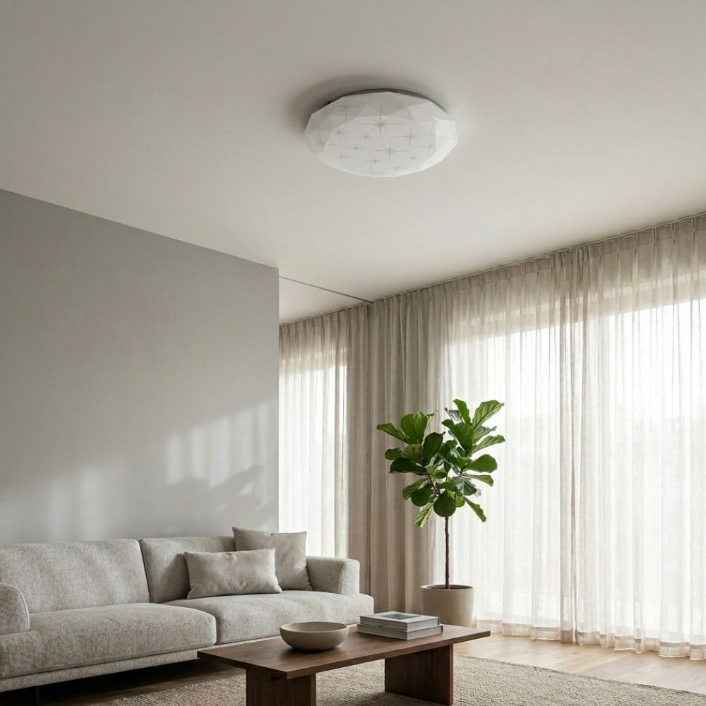 LED plafonjera R-A31 predstavlja vrhunac modernog dizajna, spajajući oštre geometrijske linije sa suptilnim detaljima. Specifičnost ovog modela je fasetirani "diamond cut" difuzor koji podseća na brušeni dijamant, dodatno ukrašen diskretnim motivima zvezda. Kada je upaljena, ovi detalji kreiraju efekat svetlucavog noćnog neba, dok u isključenom stanju plafonjera deluje kao moderna skulptura na vašem plafonu.