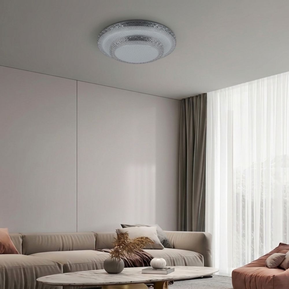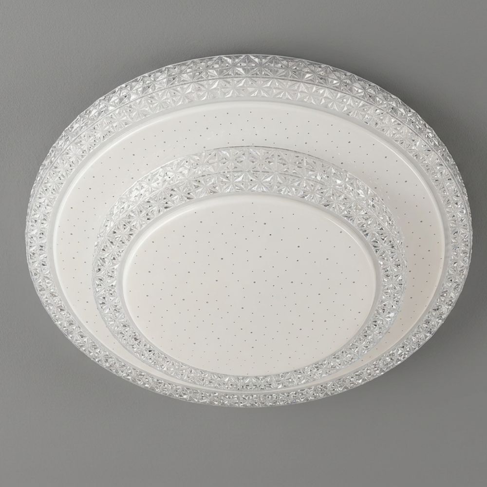 Unesite blistavu svežinu i moderan stil u vaš dom uz LED plafonjeru R-A51. Ova okrugla plafonjera specifična je po svom višeslojnom dizajnu i akrilnom difuzoru sa kristalnom teksturom koji stvara prelep "starlight" efekat, pružajući ravnomerno i prijatno osvetljenje bez bljeska.