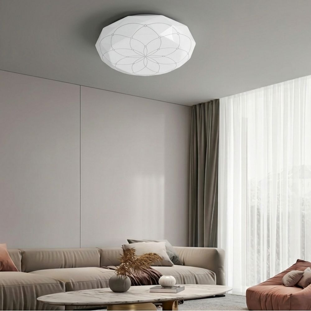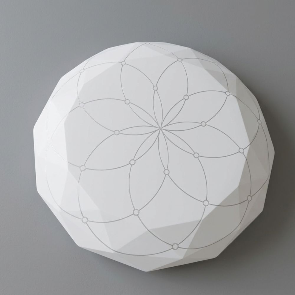 Unesite dodir moderne geometrije i čiste svetlosti u vaš dom uz LED plafonjeru R-A57. Ova kompaktna, okrugla plafonjera specifična je po svom višeslojnom, fasetiranom dizajnu koji podseća na brušeni kristal, a koji je upotpunjen delikatnim sivim linijama koje formiraju prelepu centralnu geometrijsku rozetu (Cvet života- motiv).