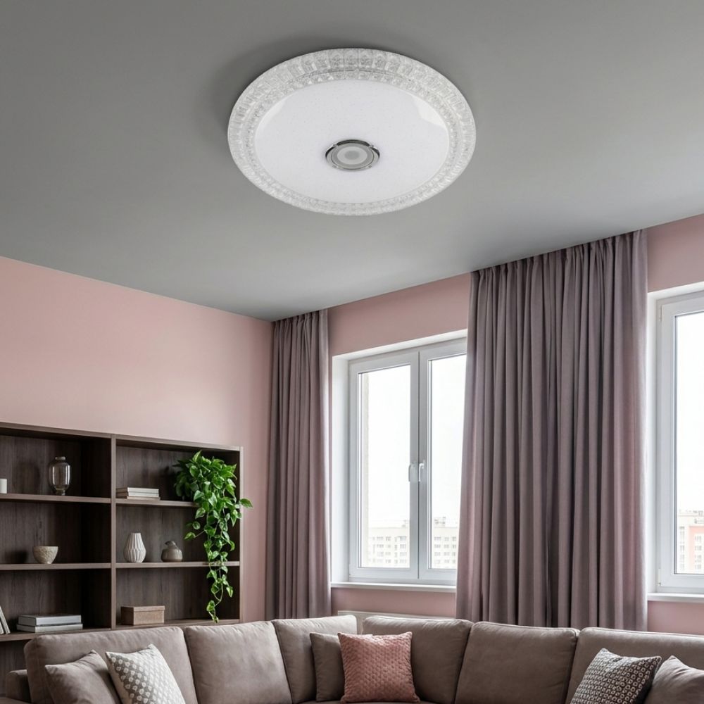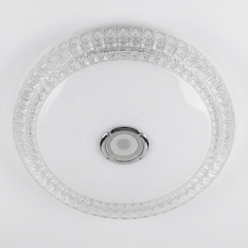 Plafonjera se izdvaja luksuznim dizajnom sa dvostrukim prstenom kristalnih segmenata koji prelamaju svetlost i vizuelno obogaćuju prostor. Uz to, nudi potpunu kontrolu – menjajte temperaturu bele svetlosti (3000K-6500K), birajte između miliona RGB boja ili sinhronizujte svetlo sa ritmom muzike, sve to putem intuitivnog daljinskog upravljača.